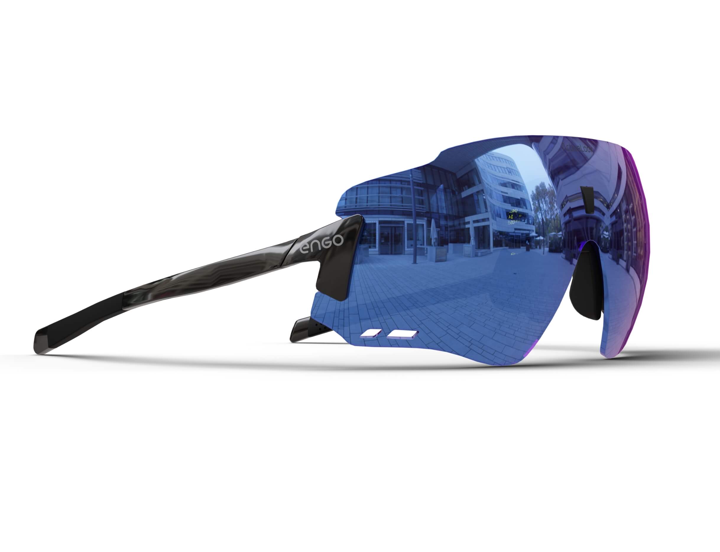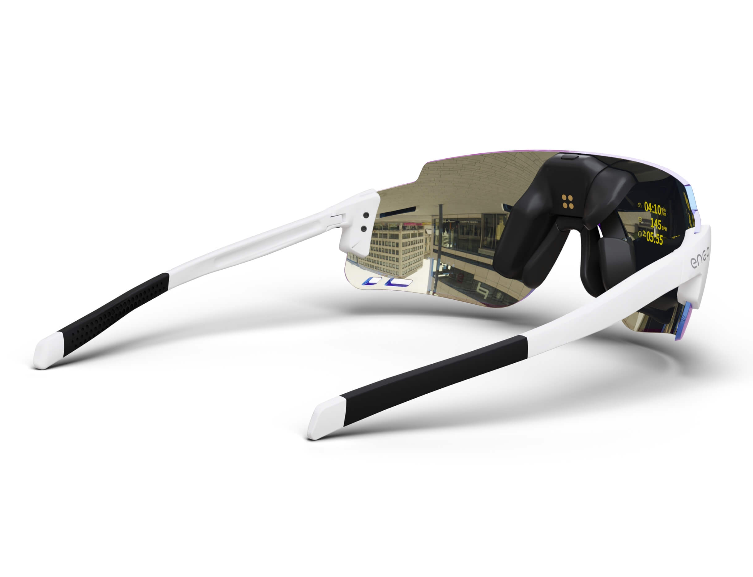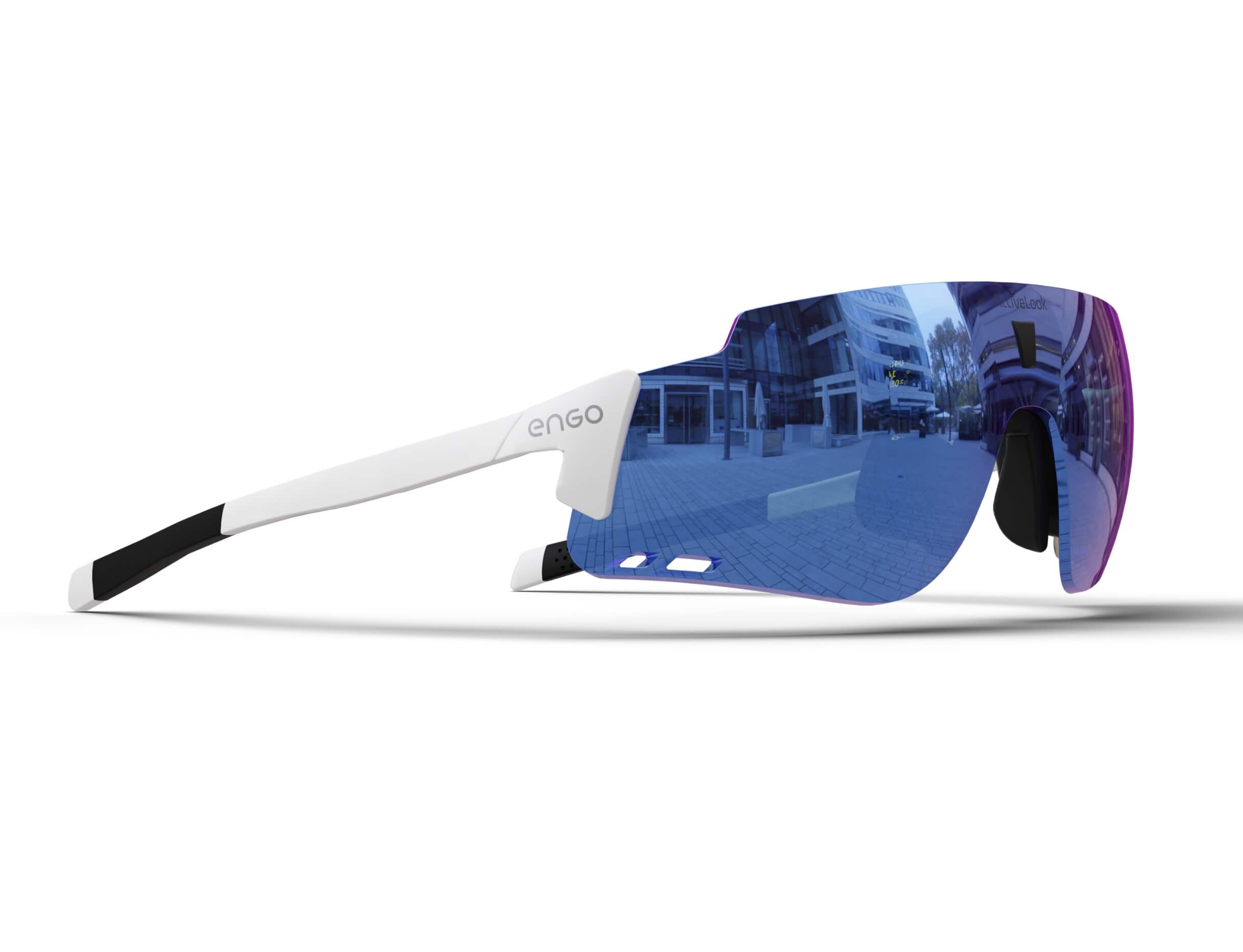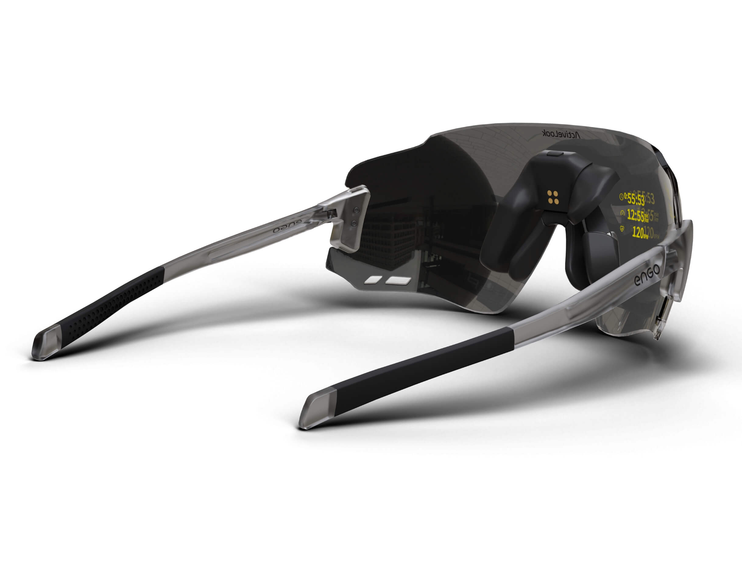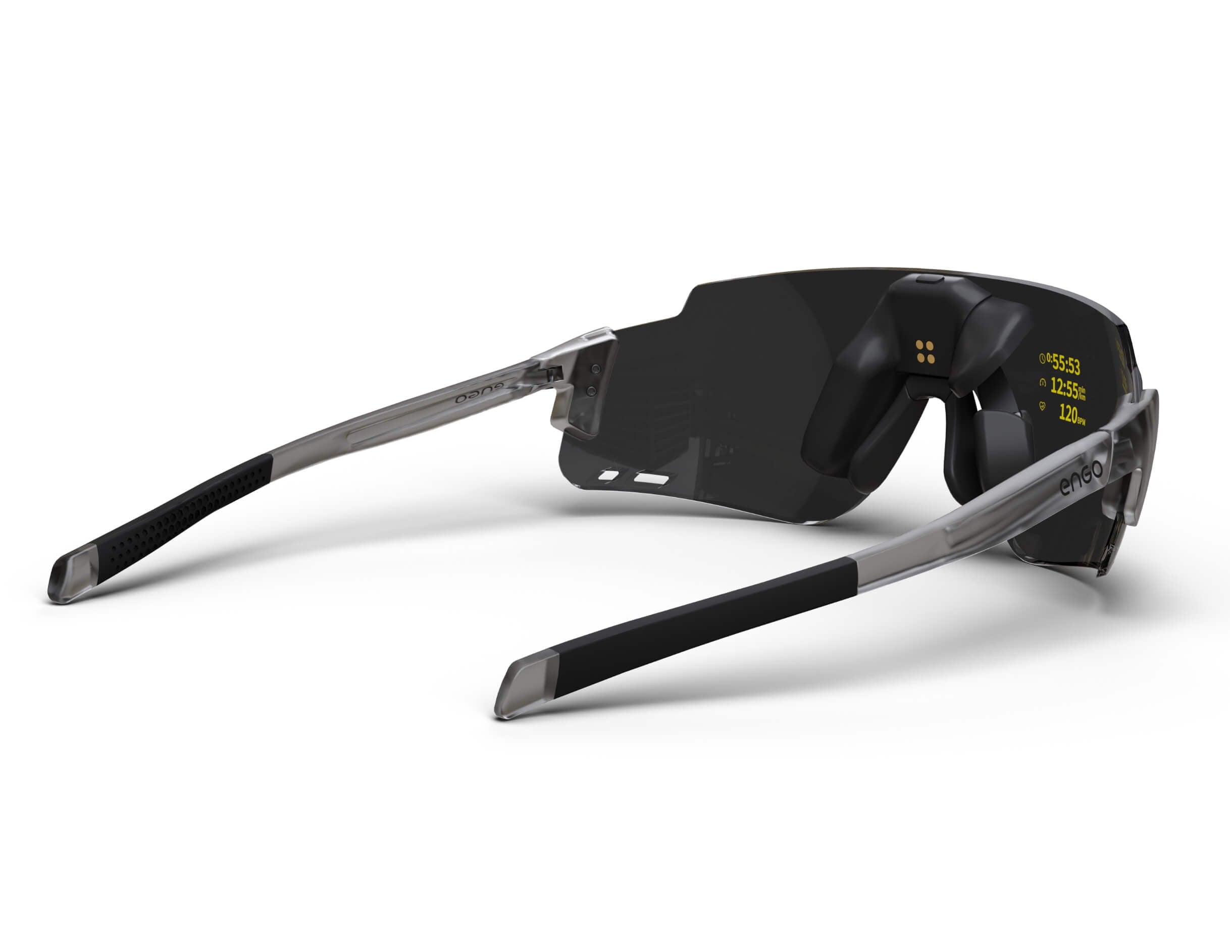 The ENGO display sits slightly left in your field of vision, like reading a road sign without turning your head. Available for your right eye, it's there instantly when you need data, invisible when you don't. Your brain naturally filters it out during focus, brings it forward on demand. Non-obtrusive by design.
